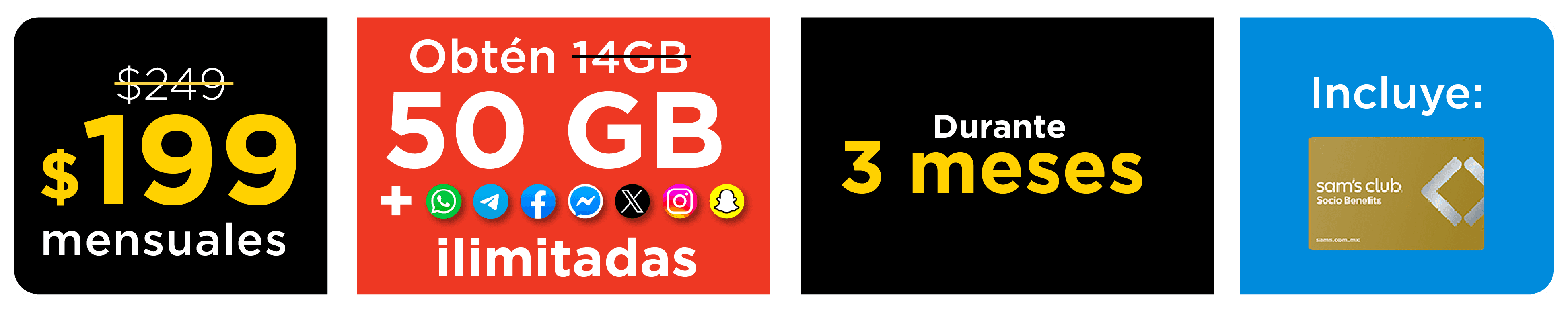 Conservas tu número Por $100 al mes recibes 9 GB + redes sociales ilimitadas (Facebook, Instagram, Messenger, WhatsApp, X, Snapchat y Telegram) Tu primera recarga ya viene incluida al comprar tu chip La promoción dura 12 meses completos Disfrutas de cobertura nacional